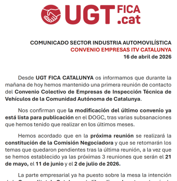 Desde UGT FICA CATALUNYA os informamos que durante la mañana de hoy hemos mantenido una primera reunión de contacto del Convenio Colectivo de Empresas...