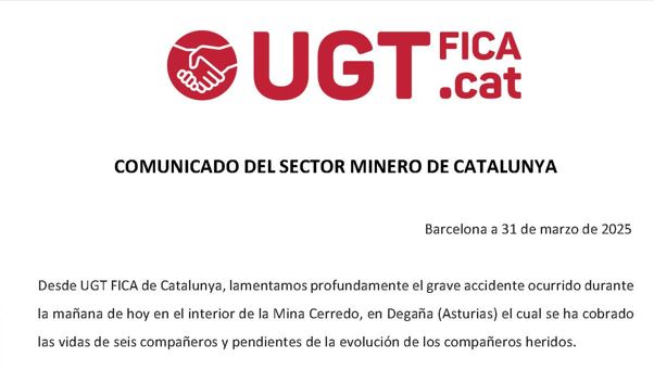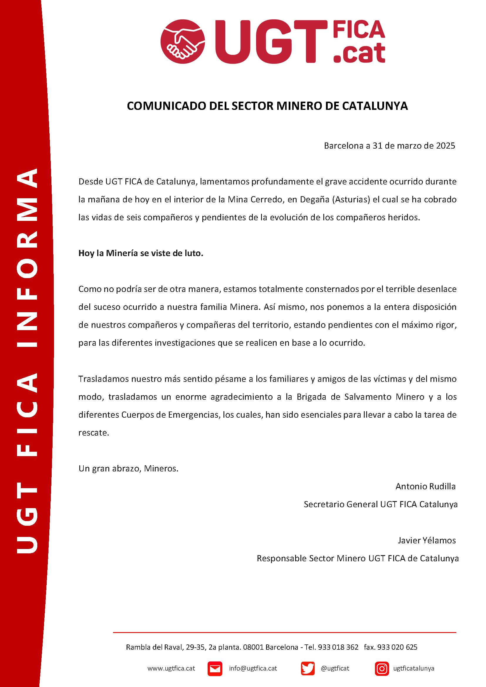 Desde UGT FICA de Catalunya, lamentamos profundamente el grave accidente ocurrido durante la mañana de hoy en el interior de la Mina Cerredo, en Degaña (Asturias) el cual se ha cobrado las vidas de seis compañeros y pendientes de la evolución de los compañeros heridos.